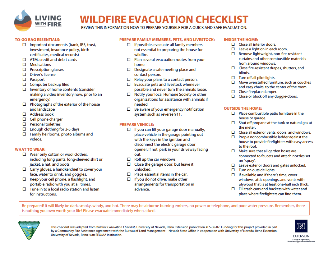 Keep in mind that during times of particularly high fire danger, it’s a good idea to have your go bag ready before a fire starts or an evacuation notice is issued.